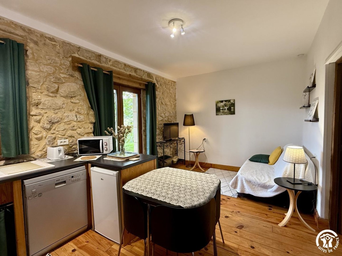 Il dispose d’une cuisine ouverte équipée, avec cafetière Senseo, Lave-vaisselle, lave-linge donnant sur un salon confortable avec canapé convertible et télévision.