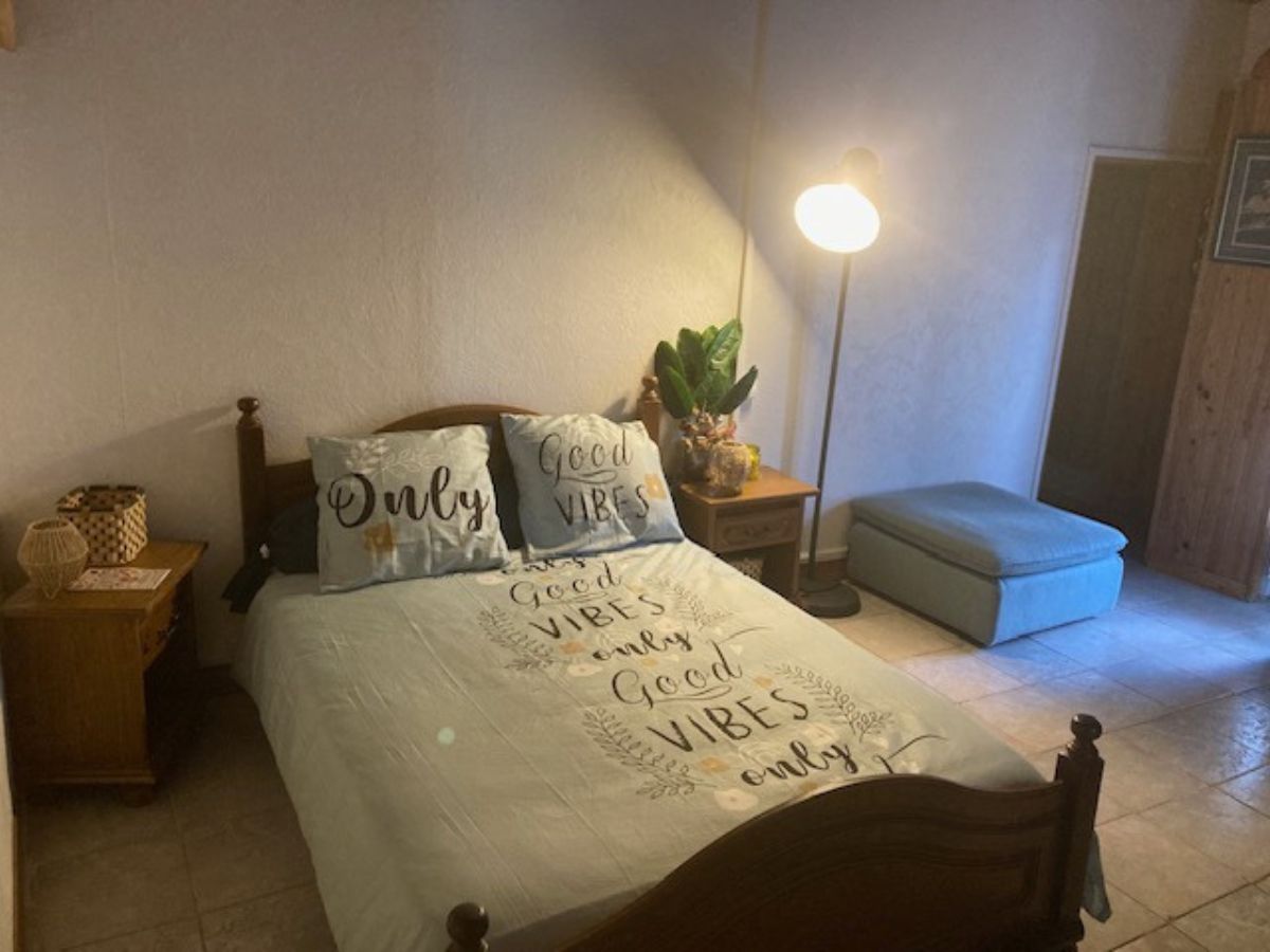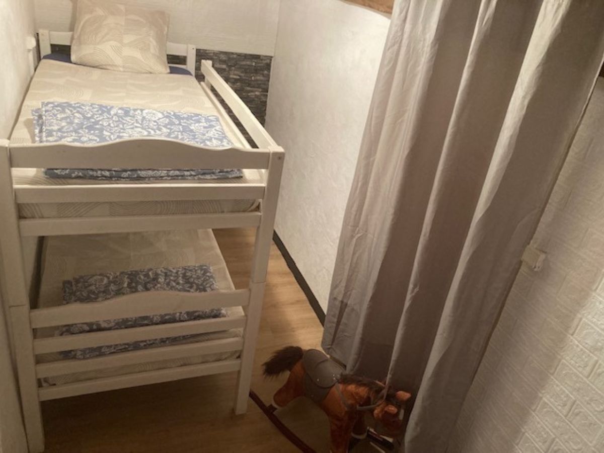 Le logement, climatisé, comprend une pièce de vie avec un lit double, une petite chambre avec un lit superposé (parfait pour les enfants !), une cuisine équipée pour préparer vos repas comme à la maison, une salle d’eau avec douche hydrojet.